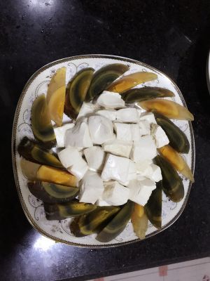 将嫩豆腐切小块,皮蛋切小块,装盘摆好