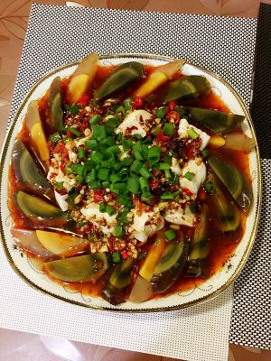 再将两者混合加入盐,鸡精,麻油拌匀(用一次性手套)。做好造型加点辣油,榨菜装饰即可