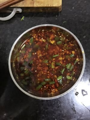 碗中放入蒜末,韭菜末,1勺盐,1勺鸡精,一勺生抽,一勺香油,少许花椒油,一勺辣椒油