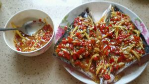 鱼头撒一点点盐,然后把调好的剁椒酱料放到鱼头上。