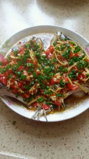 盘底放姜葱垫底,把用料酒和盐腌制过的鱼头放在上面,浇上炒锅所有的料,蒸12分钟