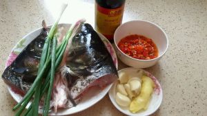 把材料准备好,鱼头洗干净,蒜头剁碎,姜切成丝备用。