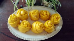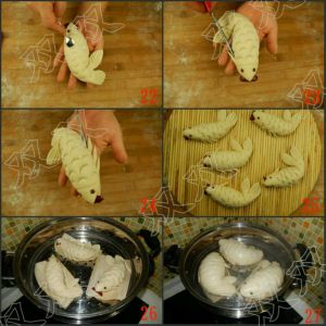 图22:用小号的勺子,自尾部开始,压上花纹,做鱼鳞。 图23:在鱼身的一侧剪侧鳍。 图24:另一侧剪三条,做背鳍。 图25:将鱼依次完成,静置醒20-30分钟。 图27:蒸锅放足量清水,鱼馒头垫玉米皮,放入蒸锅。 图28:大火将水烧开,转中火,蒸20分钟关火,焖5分钟开盖子即可。