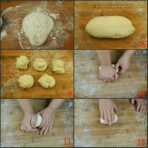 图7:将发酵好的面团取出,加入干面粉,揉匀。 图8:揉至再也没劲揉入干面粉为止,表面光滑。 图9:将其均分成5份。 图10:取一个面剂,不断揉至表面光洁、顺滑。 图11:用右手四指和拇指不断将截面揉和至掌心处。 图12:将其搓长。
