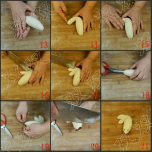图13:不断将面团搓长,形成顶端尖细,中间略粗,尾部尖细的形状。 图14:将尾部向上折叠。 图15:用手轻压。 图16:用刀自中间位置切断。 图17:用刀在上面压上花纹。 图18:用剪刀自头部剪开一口。 图19:将大枣丝塞入鱼嘴内。 图20:用刀在鱼头前部压上印。 图21:点缀红豆,做鱼眼睛。(用比红豆粗的习惯,在眼睛位置略压下,眼睛会更漂亮哦!没有可省略)