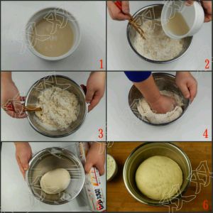 图1:温水化开酵母粉。 图2:面粉加入盆内,慢慢倒入酵母粉水。 图3:边倒边用筷子搅拌成絮状。 图4:用手不断揉搓,使面絮不断粘合。 图5:揉至表面光滑,盖保鲜膜或锅盖。 图6:静置温暖处,发酵至2-3倍大。