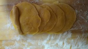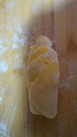 揪一小块面团搓成长与面片直径相仿的直径约1cm圆柱放入面片底部,从下向上卷成圆柱。