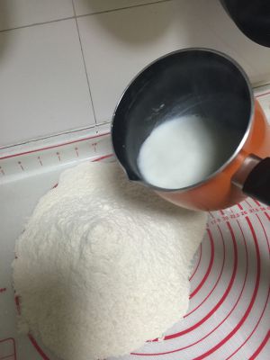 酵母加入一点温水搅拌均匀,面粉加入和好的酵母,牛奶开始和面,然后发酵制作