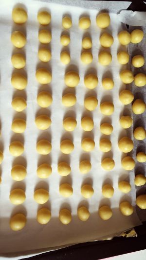 耐心的揉成小圆球,这步需要些时间,请耐心。最后烤制前喷上些水,我没有喷壶,就拿手抖了些水,防止裂开。