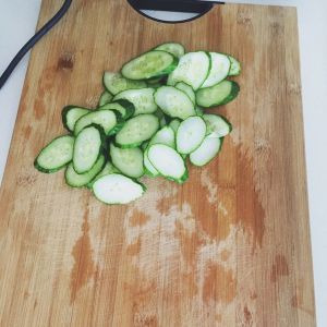 鸡蛋放一点盐打散 下锅炒 (后面没有拍照 )总之就是先炒鸡蛋 再炒黄瓜 黄瓜差不多熟了再把炒过的嫩嫩的鸡蛋倒进去 翻炒十几秒就可以出锅啦