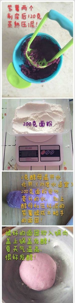 紫薯削皮后切成两半,煮熟后加入白砂糖,捣成泥,放凉