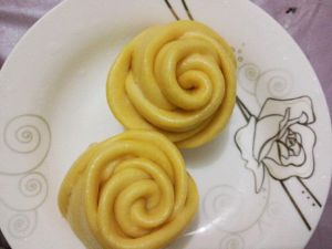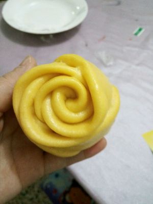 放入面粉揉成光滑的面团,搓成长条,切出小剂小,再用擀面仗擀成薄片,五张面片依次重叠,要留点距离,卷起来中间切开,两朵含苞欲放的黄玫瑰就出来了
