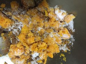 南瓜泥凉到30度左右,拌入酵母、泡打粉和白糖,放置10分钟左右