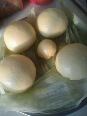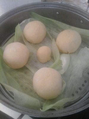 坐锅烧水,水开放入馒头型肧,大火20分钟(铺了玉米叶,我的锅下面还煮了玉米)