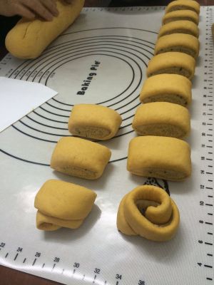 把面团分成很多份小挤,然后揉成条。往里面卷,如图