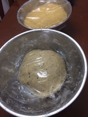 和面。南瓜泥和一个,红糖芝麻和一个