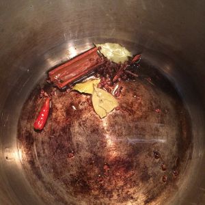 锅里热油,下姜片、八角、桂皮爆香,一下下就可以了(油温太高注意不要炸糊炸焦)