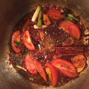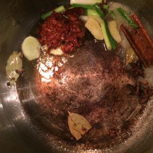 等香料出一点香味了,放葱段姜片,再放入两勺白糖,两勺郫县豆瓣酱,一定要小火慢慢炒出香料的香味,而且小火可以避免郫县豆瓣糊锅