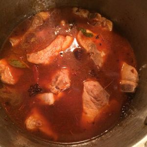 把煮好的排骨捞出,锅热油,放入白糖,等白糖化了(起沫),把排骨导入,翻均匀使其完全上色,放入花椒,八角,翻炒一会闻到花椒的香味,倒入土豆,添水到锅里总量的一半,放入盐,中火顿28分钟,把辅料倒入,大火翻炒。