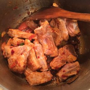 调入酱油翻炒均匀(酱油很浓颜色很深不能放多了,不然排骨烧出来颜色太黑不漂亮了)