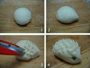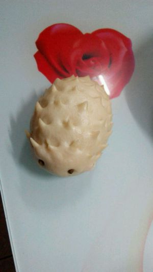 1、和面:将酵母溶于温水,缓慢加入到面粉中,揉成光滑的面团; 2、发酵:揉好的面团蒙上保鲜膜醒发,发酵至原来2倍大即可; 3、成型:取出发酵好的面团,按揉几下,排出面团内部的气泡。把面团揉成圆条状,分割成面剂,揉圆后将一端捏尖作为刺猬的头,用干净的剪刀剪出身上的刺,嵌上葡萄干作为眼睛; 4、醒发:蒸锅中加足量凉水,将纱布浸湿铺在蒸屉上,摆上刺猬馒头坯,先不开火,让馒头坯静置醒发10分钟;