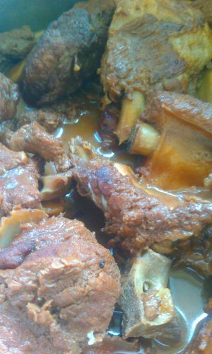 2.锅中放油,糖,炒糖色。排骨翻炒均匀,加入红烧酱油味极鲜料酒,翻炒。放高汤,干黄酱。