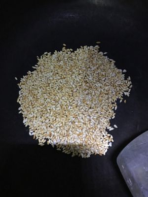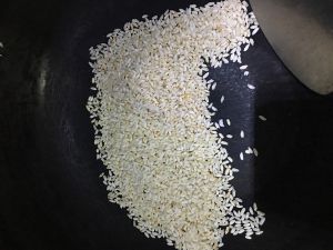 干锅内放大米或糯米,中火不停翻炒,至米粒中的水分被炒出。(如果用电磁炉大概1200~1300)