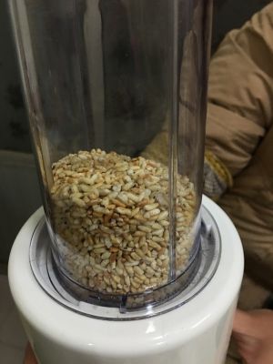 把炒好的米粒盛出,待放凉,用类似榨汁机的东西打碎。放凉时米粒特别脆,可直接吃,好好吃哈哈哈