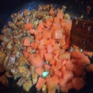 放入胡萝卜丁继续翻炒至略微软烂~