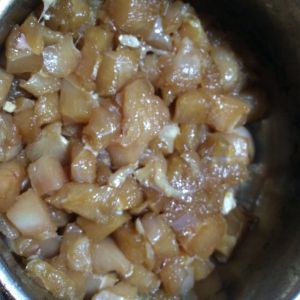 鸡肉丁、土豆丁、花生放一起,加一碗左右水,加酱油、白醋少许,糖(多),盐少许,淀粉加水倒入,勾芡,翻炒,收汁,即可。
