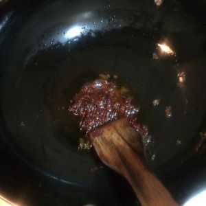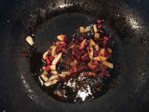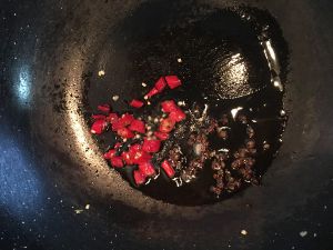 倒入豆瓣酱和姜蒜等,炒出红油