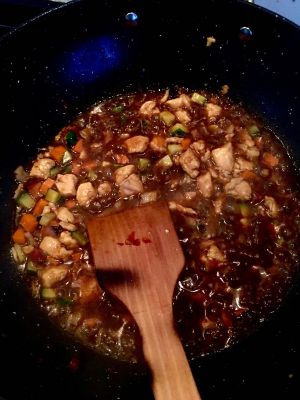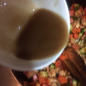 加入鸡丁,黄瓜,胡萝卜,翻炒片刻,加入生抽,老抽,醋,糖,淀粉和水兑成调味汁