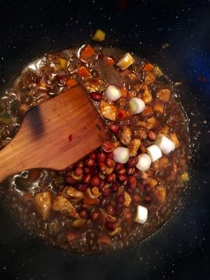 热油锅,放入郫县豆瓣,炒出红油,放入鸡丁翻炒片刻~