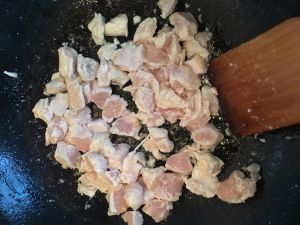 鸡胸肉入锅翻炒至发白,倒出备用。