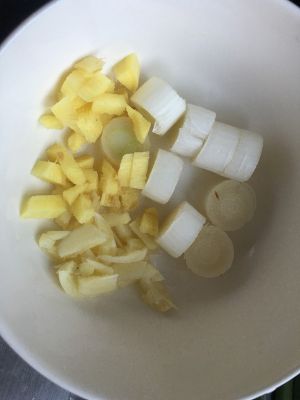 鸡腿洗净;去骨、去皮,切丁;放一勺淀粉、少许黄酒(多了发苦)、盐味精,腌制片刻。