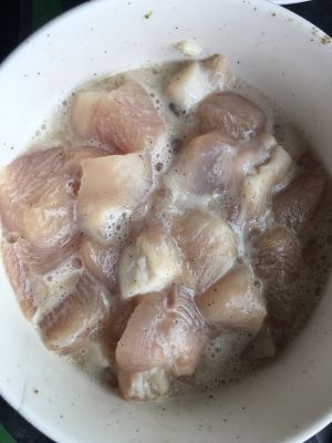 鸡胸肉切方块,放黑胡椒粉、南酒、耗油~腌制一会儿