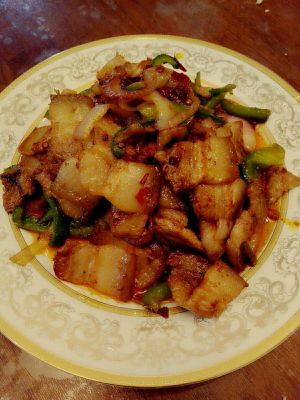 五花肉切条,下冷水煮,水开5分钟捞起切片。下200+温度油锅炸5秒时间。尖椒,洋葱切片。