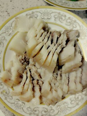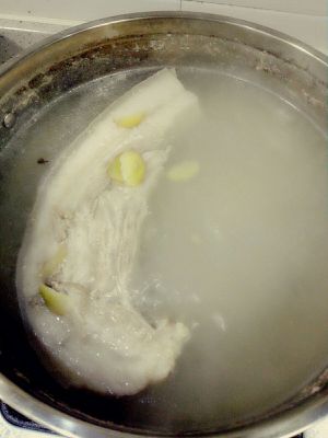 五花肉下锅,清水没过五花肉,放入适量盐、料酒,大火烧开煮十分钟,然后捞出,放至冷却。