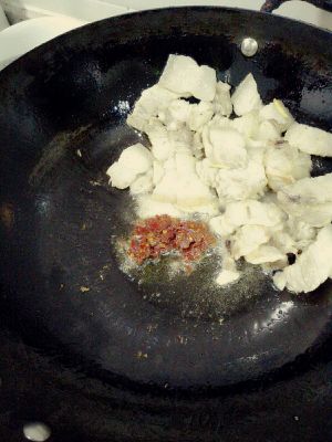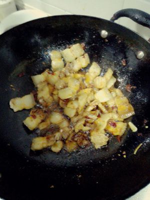 第四步:煸炒出肉油的时候放入豆瓣酱,炒出红油。