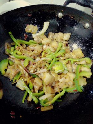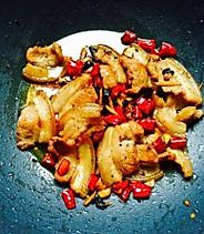 炒酱料: 加菜油烧到2成热,加郫县豆瓣酱 牛肉酱炒香,去除渣,这样吃起来感觉不糊,成菜也好看,锅离火,加猪肉加尖椒片加盐,味精,鸡精,酱油,十三香(要很少,看不出那种),加干辣椒,加花椒,加麻油。开大火翻炒,这时会出现有点点焦味,加黄酒。再翻炒,酒会立即干了,然后加油花生油,加麻油,加洋葱翻炒,锅里会立即冒青烟。离火加锅盖焖10秒钟。加糖翻炒均匀出锅。这样的效果是让肉不硬,尖椒更嫩,洋葱带着脆感。