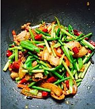 翻炒至郫县豆瓣酱完全呛入回锅肉里后,加入蒜苔,青椒,红椒,适量盐,继续翻炒。炒至蒜苔完全熟透,鸡粉调味,勾芡一下,即可起锅装盘。