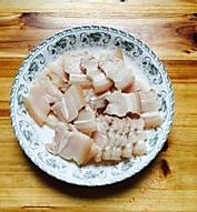 五花肉煮个7分熟,捞起切片,刀功好的能切薄点切薄点。蒜苗切段,切蒜苗时头头要拍下,刀放到切。