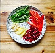 干辣椒切小段,姜切丝,大蒜子拍碎,红椒切片,青椒切片。