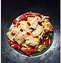 回锅肉下锅,翻炒片刻,依次加入姜,大蒜子,干辣椒,翻炒至香。