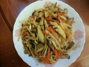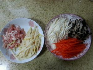 锅放油烧热放入肉丝煸炒,加入胡罗卜丝翻炒以后加入笋丝、交白丝、香菇丝加入一点盐和鲜酱油、醋、糖翻炒即可。