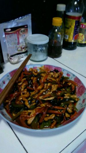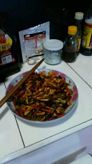 把调料用中碗调一下,半晚水,淀粉不要放太多,锅中放油在放一勺白糖小火炒糖色,炒成深棕色后放鸡肉和辣椒丝大火炒几下,之后放胡萝卜丝。木耳丝,葱丝再炒几下最后倒入那碗调料快速翻炒几下出锅