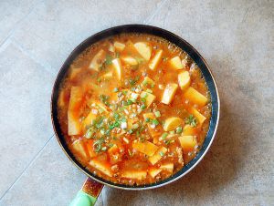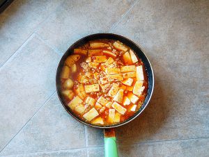 4,入豆腐,勿搅动。快出锅时加点水淀粉勾下,撒点葱花或香菜之类点缀。