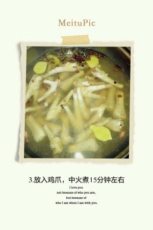 冷水放鸡爪入锅,锅内放姜块和酒去腥,立刻加盐调味,水烧开后,转小火煮2分钟至凤爪熟透。
