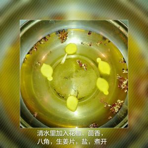 在清水里加入花椒我,茴香,八角,生姜片,盐适量,煮开