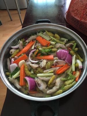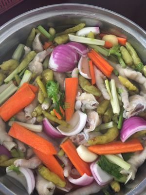 所有配料和鸡爪,一起放入盆里